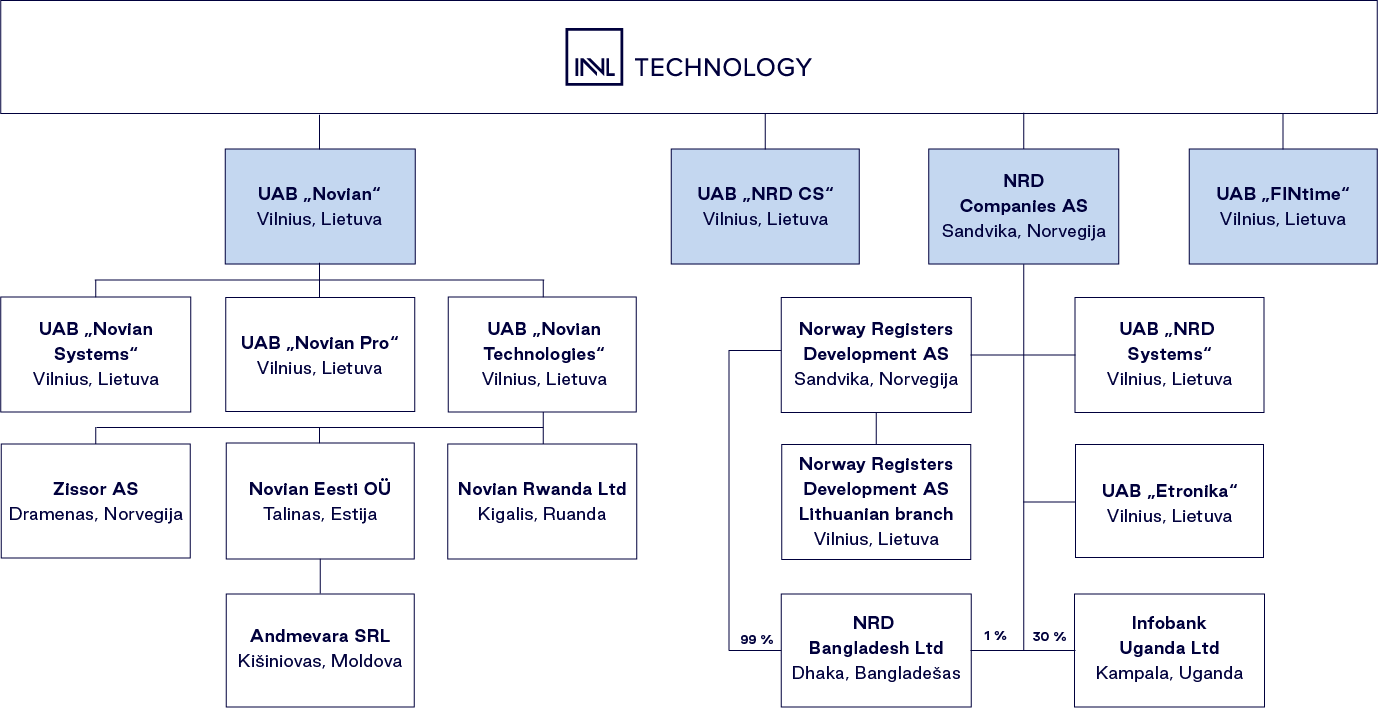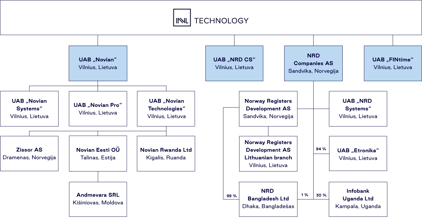 „INVL Technology“ sudaro trys įmonių grupės: „Novian“ (pirmaujanti Baltijos šalių IT bendrovė), „NRD Companies“ (pasaulinė „GovTech“ bendrovė) ir „NRD Cyber Security“ (kibernetinio saugumo bendrovė). -
